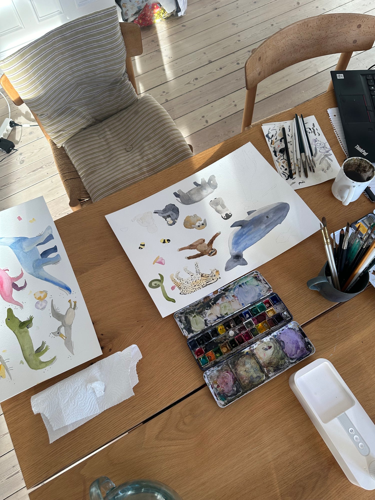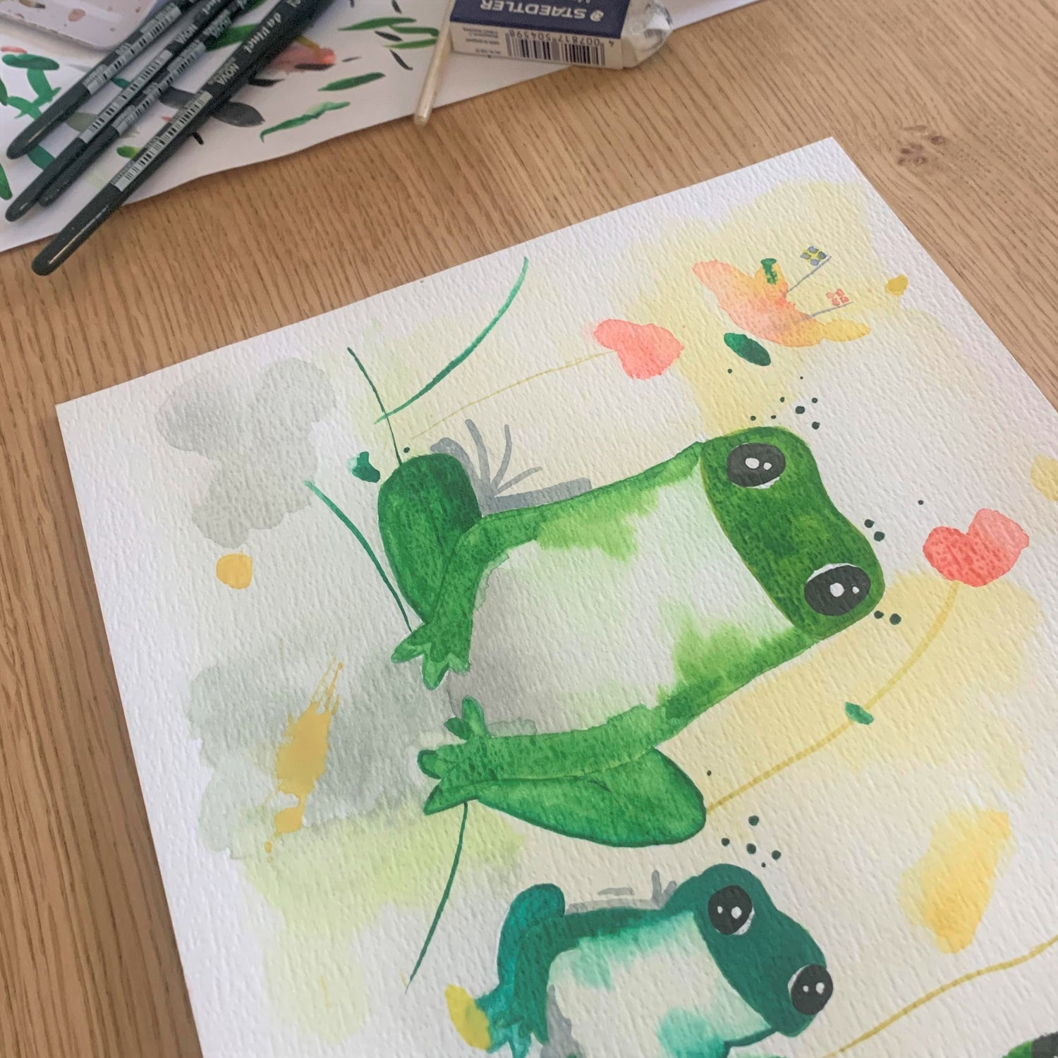 Min helt store kærlighed indenfor kunst er akvarellerne. Jeg slår fine, ret nøjagtige blyantstreger og dernæst giver jeg slip med akvarellerne. Jeg synes stilen giver malerierne en sjov kombination af et roligt udtryk sammen med et enormt spil af farver og forskellige retninger, som giver malerierne liv.
