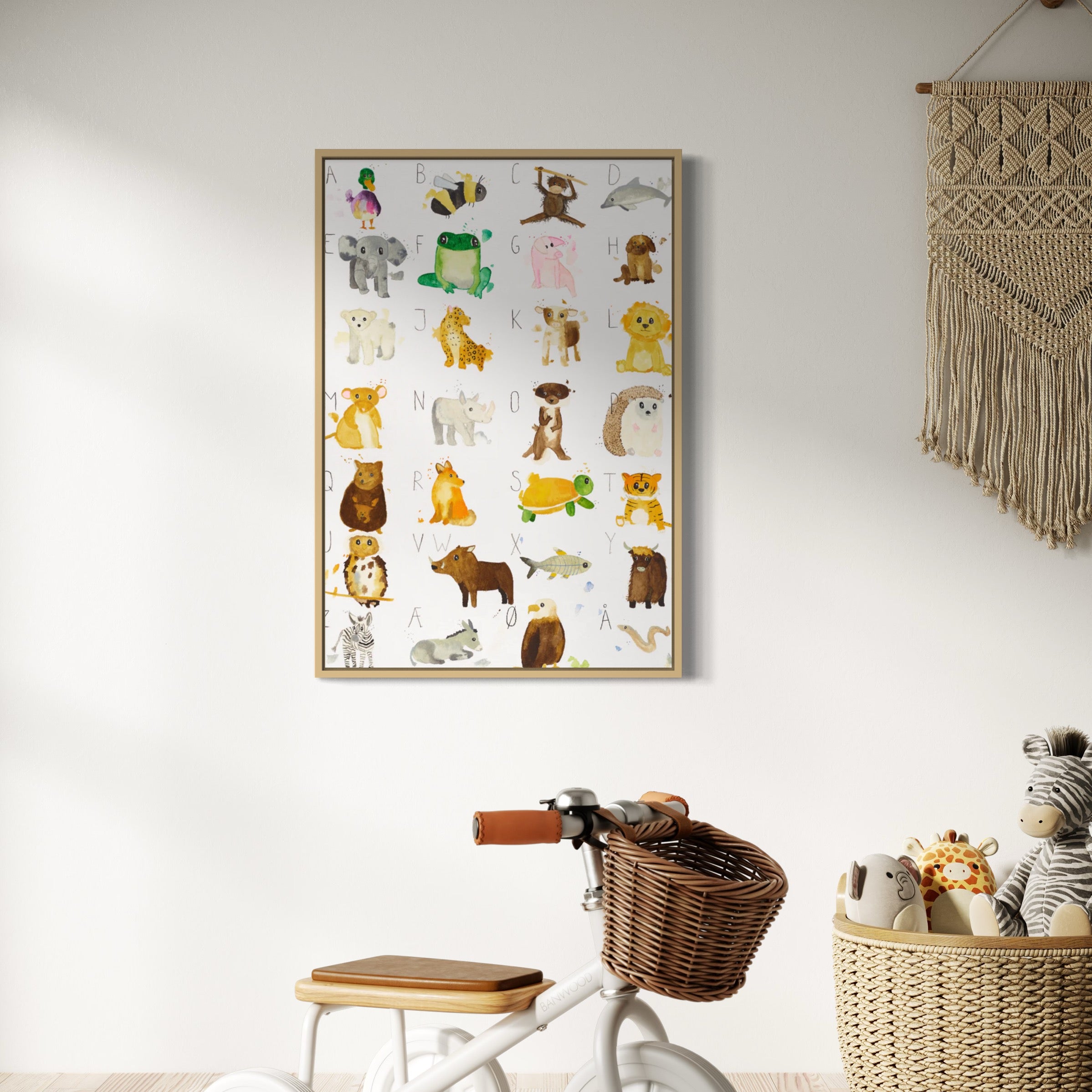 Børne ABC plakat med dyr i træ