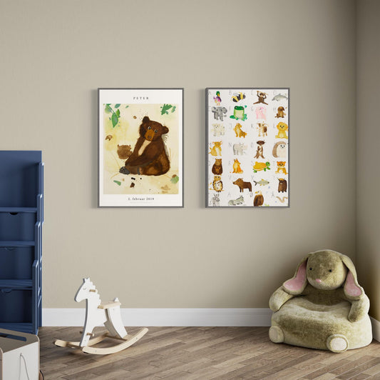 Børne navneplakater er en personlig gave til en lille nyfødt eller barnedåb. En navneplakat med dyr skaber eventyr på børneværelset.