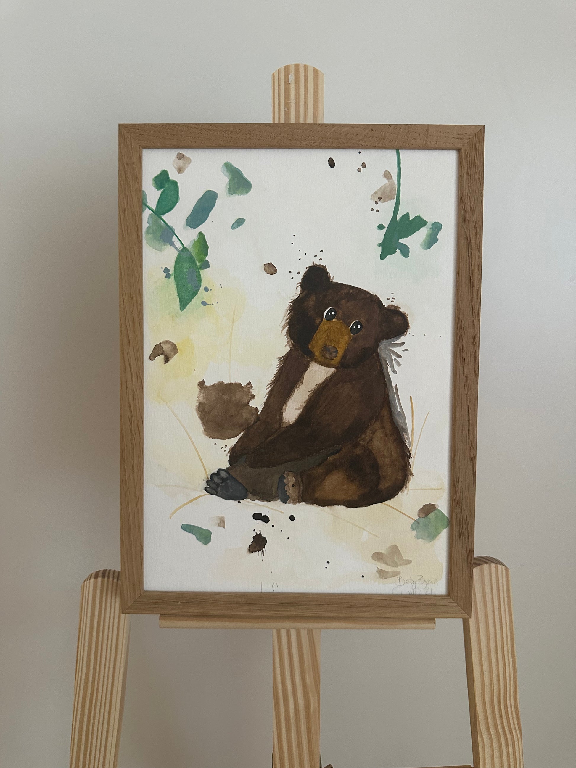 En betænksom lille Bjørn, som kigger ud på verden med nysgerrighed. Malet med akvareller på A4. Motivet fås også som plakat.