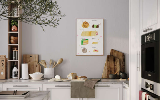 Kaffe og wienerbrød - skønne ting som jeg elsker at spise og drikke, og som jeg med stor fornøjelse har malet. Disse akvarelplakater hænger rigtig smukt i køkkenet, eller på billedvæggen i stuen.